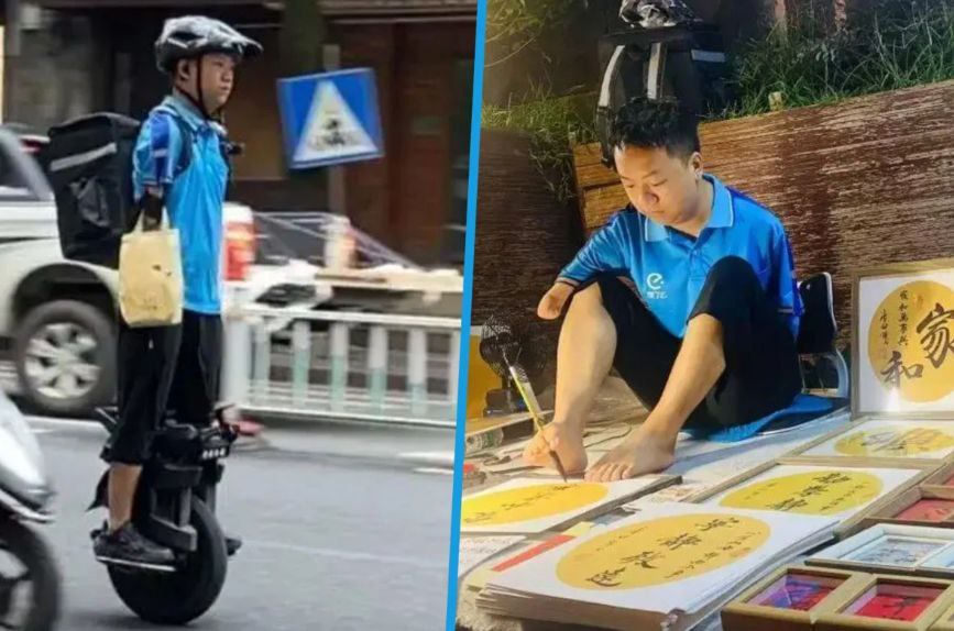 အမျိုးသားတစ်ဦးဟာ လက်နှစ်ဖက်မပါတဲ့ မသန်စွမ်းသူဖြစ်ပေမဲ့ လျှပ်စစ်ယူနီဘီးကို အသုံးပြုပြီး အစားအသောက်ပို့သမားအဖြစ် အလုပ်လုပ်ကိုင်နေပါတယ်။ သူက ဒီအလုပ်ပြီးရင် ညကျ သူ့ခြေထောက်နဲ့ ရေးဆွဲတဲ့ လက်ရေးလှလက်ရာတွေကို ဈေးဆိုင်လေးထောင်ပြီး ရောင်းချပါသေးတယ်။