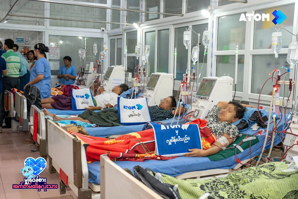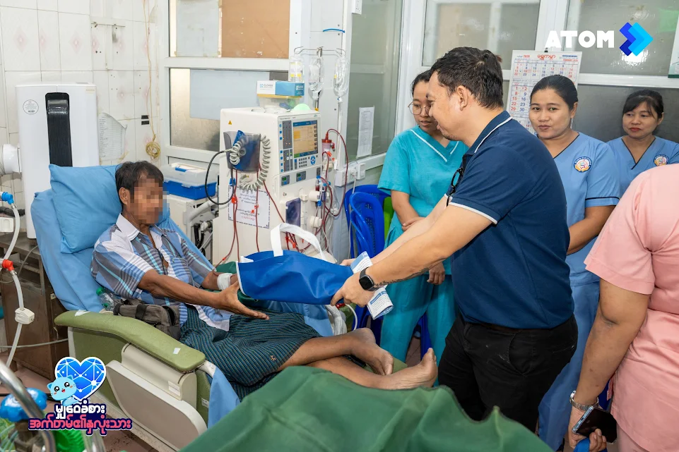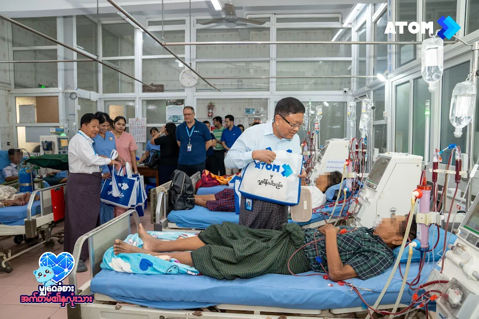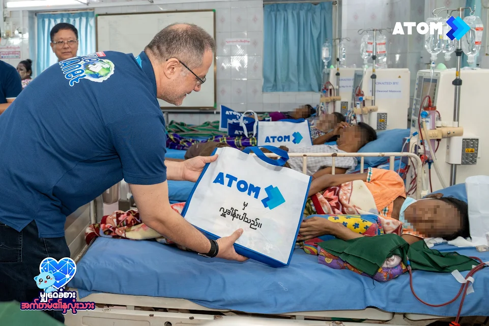 မြန်မာနိုင်ငံ၏ အကောင်းဆုံး 4.5G ဝန်ဆောင်မှု ပေးအပ်နေသည့် အက်တမ်(ATOM) သည် လိုအပ်နေသော လူမှုအသိုင်းအဝိုင်းအား ကူညီပံ့ပိုးပေးရန် ဟူသော ကတိကဝတ်အတိုင်း ရန်ကုန်မြို့၊ ကျောက်တံတားမြို့နယ်ရှိ မွတ်စ်လင်ကုသိုလ်ဖြစ်ဆေးရုံသို့ ကျောက်ကပ် ဆေးစက်တစ်လုံး လှူဒါန်းမှုပြုလုပ်ခဲ့သည်။ စုစုပေါင်း အမေရိကန်ဒေါ်လာ ၁၃,၅၀၀ ခန့် တန်ဖိုးရှိ အဆိုပါ လှူဒါန်းမှုသည် အရေးပေါ် ကုသမှုလိုအပ်နေသော လူနာများအတွက် အသက်ကယ် ကျောက်ကပ် သန့်စင်ဆေးကြောခြင်း ဝန်ဆောင်မှုအား ပိုမိုလက်လှမ်းမှီစေရန် ရည်ရွယ်သည်။