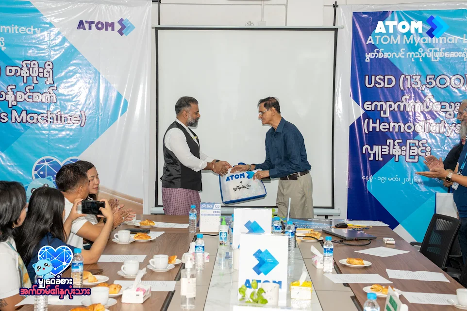အက်တမ်(ATOM) ၏ ကော်ပိုရိတ်ရေးရာ အရာရှိချုပ် ဦးသိန်းဟုတ် မှလည်း “ပြည်သူလူထုကျန်းမာရေးကို ပံ့ပိုးပေးခြင်းက ကျွန်တော်တို့ရဲ့လုပ်ဆောင်နေတဲ့ လူမှုအကျိုးပြု လုပ်ငန်းတွေ ထဲမှာ အဓိက အချက်တစ်ခု အဖြစ် ပါဝင်နေပါတယ်။ အခုလှူဒါန်းမှုက အက်တမ်(ATOM)ရဲ့ လူမှုအကျိုးပြု လုပ်ငန်းမဏ္ဍိုင်ကြီး (၃) ရပ် အောက်ကနေ ဆောင်ရွက်ခဲ့တာဖြစ်သလို ကျွန်တော်တို့အနေနဲ့ တကယ်လိုအပ် ချက်ရှိနေတဲ့ နေရာတွေမှာ ကူညီပံ့ပိုးပေးနိုင်ဖို့ အမြဲကြိုးစားနေမှာပါ။ မြန်မာနိုင်ငံက လူနာတွေရဲ့ တကယ့် လိုအပ်ချက်ပေါ် မူတည်ပြီး လုပ်ဆောင်ခဲ့တာဖြစ်လို့ အရေးပေါ်ကျောက်ကပ်ဆေးသန့်စင် ကုသမှုလိုအပ်နေတဲ့ လူနာတွေအတွက် အထောက်အပံ့ကောင်းဖြစ်မယ်လို့လည်း မျှော်လင့်ပါတယ်။ အခုလိုတန်ဖိုးရှိလှတဲ့ လူမှု အသိုင်းအဝိုင်းအတွက် လူမှုဘ၀တွေအဆင်ပြေစေဖို့ ကူညီခွင့်ရတဲ့အပေါ်မှာလည်း တကယ်ကို ကျေးဇူးတင်မိပါတယ်။ စက်တပ်ဆင် ခြင်းလုပ်ငန်းစဉ်တွေအားလုံး အပြီးသတ်ပြီး လူနာတွေ အမြန်ဆုံး ကုသမှုခံယူနိုင်ဖို့ ဆောင်ရွက်သွားမှာပါ” ဟု ပြောကြားခဲ့သည်။