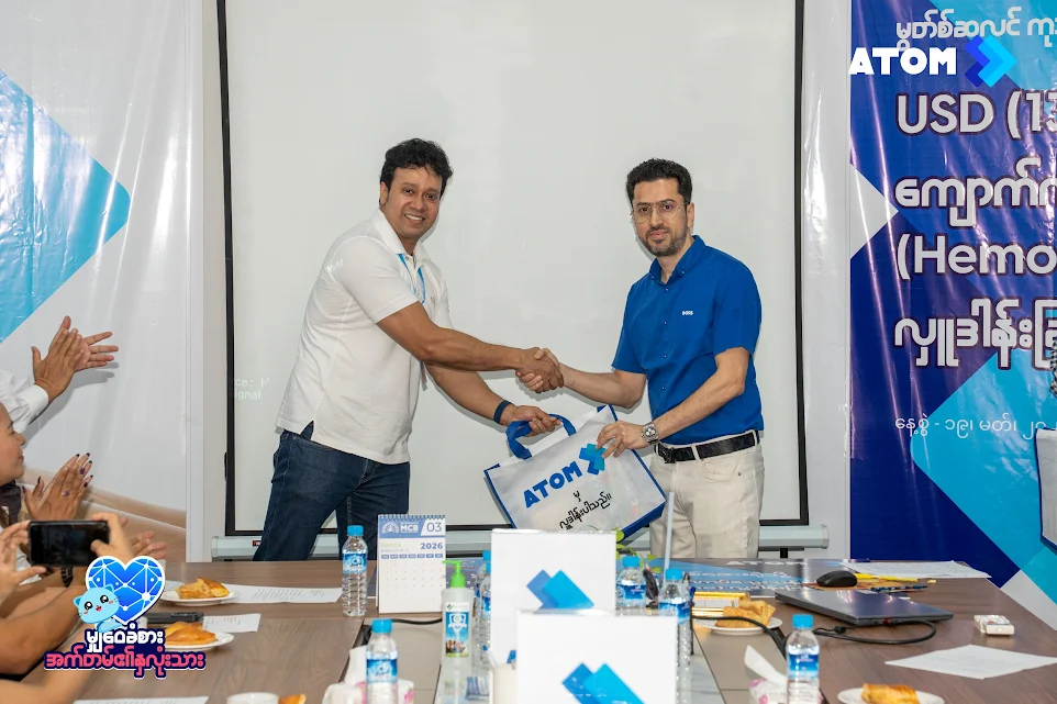 - အက်တမ်(ATOM) မှ အမေရိကန်ဒေါ်လာ ၁၃,၅၀၀ ခန့်တန်ဖိုးရှိ အသက်ကယ် ကျောက်ကပ် ဆေးစက်အား ရန်ကုန်ရှိ မွတ်စ်လင်ကုသိုလ်ဖြစ်ဆေးရုံသို့ လှူဒါန်းခဲ့။