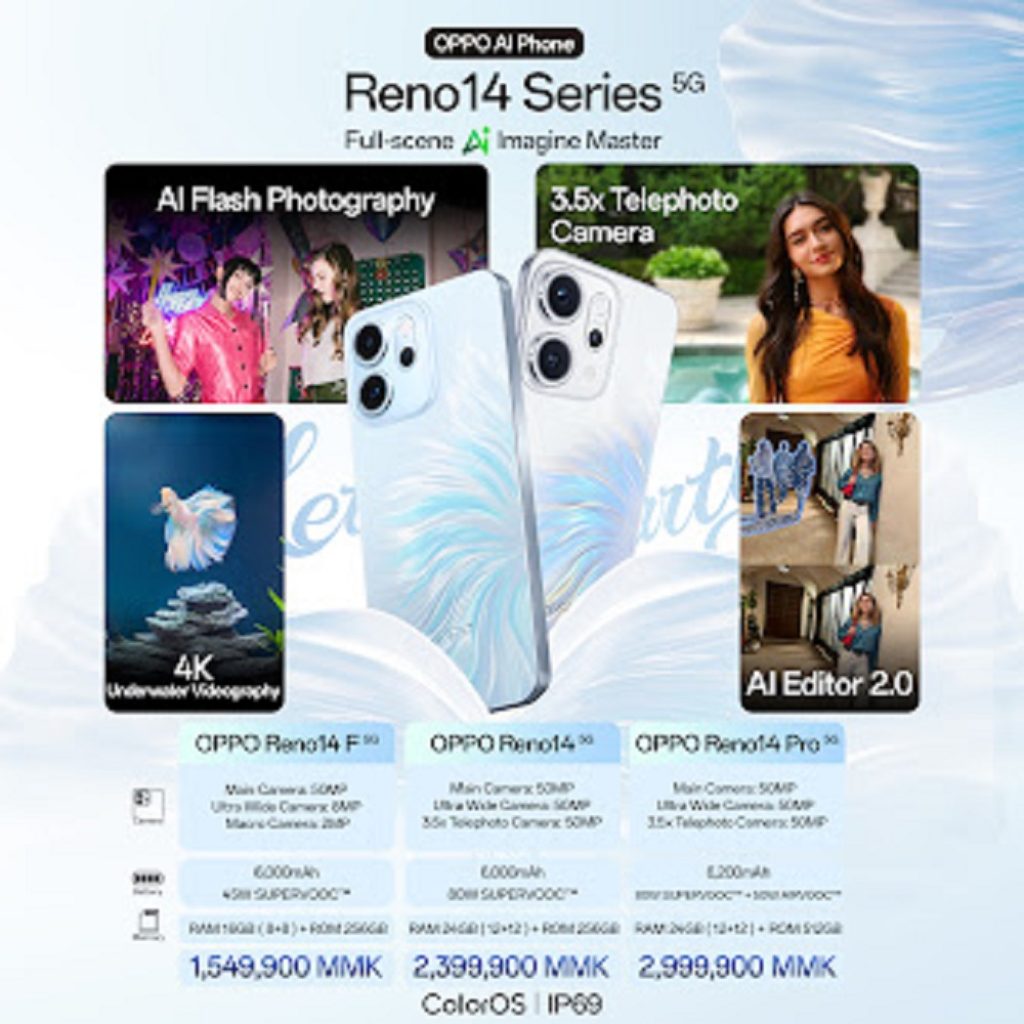 OPPO Reno14 Series 5G ဟာ ဈေးတန်းတူ စမတ်ဖုန်းများအကြား အတောက်ပဆုံးဖြစ်ပြီး သဘာဝအကျဆုံး ကြွရွပေါ်လွင်တဲ့ နောက်ဆုံးပေါ် OPPO AI Flash Photography နည်းပညာ ၊ ခေတ်ဆန်ပြီး သုံးစွဲသူတွေသဘောကျတဲ့ Iridescent Mermaid Design ၊ ခေတ်မီပြီး တိုးတက်လာတဲ့ AI လုပ်ဆောင်ချက်များ ၊ Flagship Technology လို့ဆိုရတဲ့ 3.5x Telephotography နည်းပညာ၊ ပိုမိုကောင်းမွန်တိုးတက်လာတဲ့ ဘက်ထရီ ၊ IP69 အဆင့်ရှိ ရေဒဏ်နဲ့ ဖုန်ဒဏ်တွေကို ခံနိုင်ရည်ရှိမှု အစရှိတဲ့ ဘက်ပေါင်းစုံအတွက် ပြီးပြည့်စုံတဲ့ လုပ်ဆောင်ချက်တွေ ပါဝင်လာတာကြောင့် သုံးစွဲသူတွေရဲ့ နေ့စဉ်ဘဝမှာ ပိုပြီးလွယ်ကူပေါ့ပါးအောင် ကူညီပေးနိုင်မှာဖြစ်ပါတယ်။
