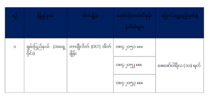 မြန်မာ့ဆက်သွယ်ရေးလုပ်ငန်း (MPT) အနေဖြင့် ၎င်း၏ ကတိကဝတ်နှင့်အညီ နည်းပညာအဆင့်မြှင့်တင်မှုပြုလုပ်ခြင်းနှင့်အတူ ရှမ်းပြည်နယ် (အရှေ့ပိုင်း)၊ တာချီလိတ်မြို့ရှိ ဖန်ကြိုးမျှင် (Fiber Cable) အသုံးပြုစနစ်သုံး အင်တာနက်လိုင်းများ နှင့် ဂဏန်း ၇ လုံးပါရှိသည့် (VoIP) အော်တိုတယ်လီဖုန်းဝန်ဆောင်မှုများအား ချိတ်ဆက်ထားသော ဖန်ကြိုးမျှင်အသုံးပြုတယ်လီဖုန်းစနစ် (OLT) အိတ်ချိန်းများကို ပြောင်းရွှေ့မည်ဖြစ်ကြောင်း ယနေ့ အသိပေးထုတ်ပြန်လိုက်ပါသည်။ အဆိုပါ ဆောင်ရွက်မှုသည် နည်းပညာအဆင့်မြှင့်တင်မှု ပြုလုပ်ခြင်းအတွက် လိုအပ်ပြီး ဝန်ဆောင်မှု ပြတ်တောက်မှုများကို အနည်းဆုံးဖြစ်စေရန်၊ ကွန်ရက်တည်ငြိမ်မှုကို မြှင့်တင်ရန် နှင့် ဒေသတွင်းရှိ MPT သုံးစွဲသူများအတွက် ဝန်ဆောင်မှုအရည်အသွေးကို တိုးတက်ကောင်းမွန်စေရန် ရည်ရွယ်ဆောင်ရွက်ခြင်း ဖြစ်ပါသည်။