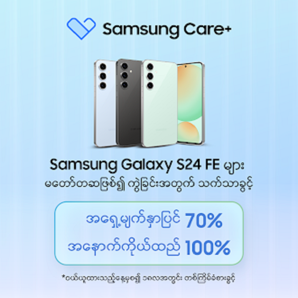 • Samsung Care+ ဝန်ဆောင်မှု ပါရှိတဲ့အတွက် မတော်တဆ ဖုန်း အရှေ့မျက်နှာပြင်ထိခိုက် ပျက်စီးခြင်း အတွက် လက်ခနဲ့ပစ္စည်းတန်ဖိုး ၇၀% အထိ သက်သာခွင့်(သို့) ဖုန်း အနောက်မျက်နှာပြင် ထိခိုက် ပျက်စီးခြင်း အတွက်လက်ခနဲ့ပစ္စည်းတန်ဖိုး ၁၀၀% အထိ သက်သာခွင့်တွေကို ဝယ်ယူပြီး ၁၈လအတွင်း ၁ ကြိမ် ခံစားရရှိနိုင်မှု