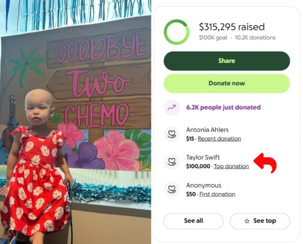 Ref: Taylor Swift Donates $100K To Help 2-Year-Old Girl Battling Rare Brain Cancer