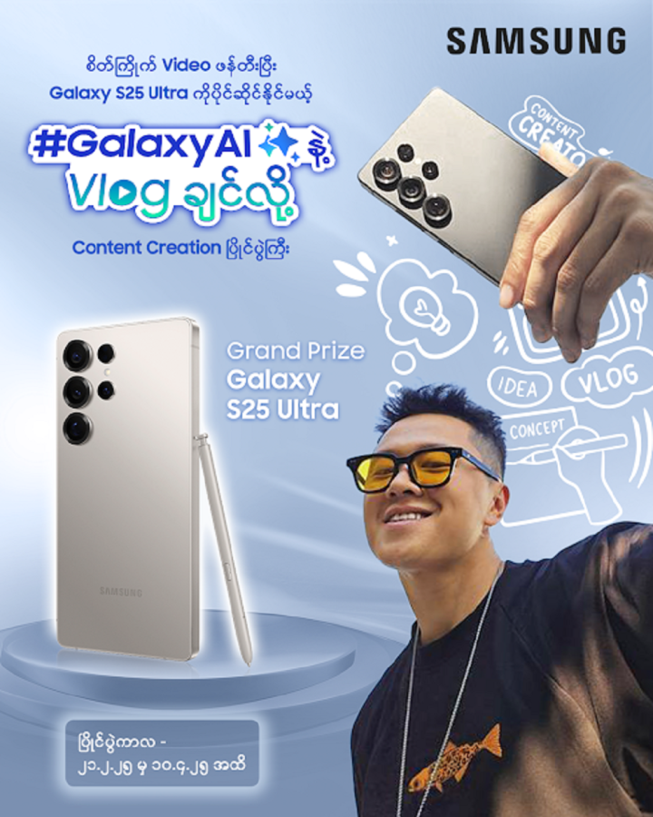Samsung Myanmar က Content Creators တွေနဲ့ Samsung ချစ်သူတွေအတွက် “#GalaxyAI နဲ့ Vlog ချင်လို့“ Content Creation ပြိုင်ပွဲကြီးကို စီစဉ်ပေးလိုက်ပြီဖြစ်ပါတယ်။ ယခုပြိုင်ပွဲမှာ “Open Your World သင့်ကမ္ဘာကို ဖွင့်လှစ်လိုက်ပါ” ဆိုတဲ့ ခေါင်းစဉ်နဲ့ လိုက်ဖက်ညီတဲ့ ကိုယ်ပိုင် Short-Form ဗီဒီယိုအတိုတွေ ကို ဖန်တီးပြီး ယှဥ်ပြိုင်ရမှာဖြစ်ပြီး ပြိုင်ပွဲဝင်များ အားလုံးထဲမှ Content Creation ဝါသနာနဲ့ လမ်းကြောင်းကို ခိုင်မာစွာ အစပြုနိုင်ဖို့ ထိုက်တန်သူ တစ်ဦးတည်းကိုသာ ရွေးချယ်ပြီး Samsung ရဲ့ အဆင့်မြင့် Galaxy AI လုပ်ဆောင်ချက်တွေပါဝင်တဲ့ နောက်ဆုံးပေါ် Galaxy S25 Ultra စမတ်ဖုန်းကို ချီးမြှင့်ပေးသွားမှာပါ။