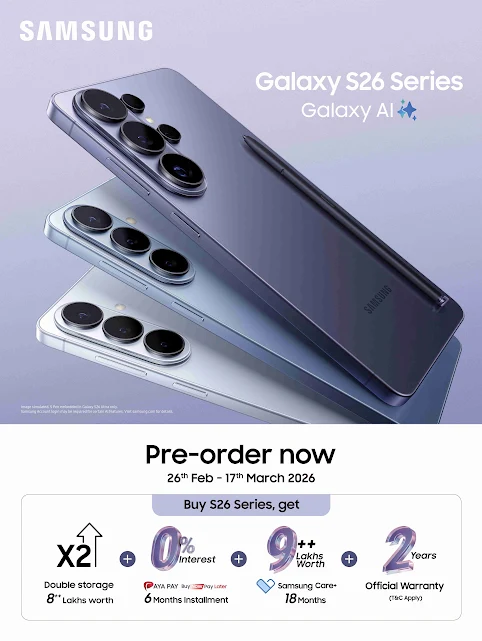 - Galaxy S26 Series ထဲက ဘယ်ဖုန်းမဆို ကြိုတင်မှာယူမယ်ဆိုရင် (၈) သိန်းကျပ်အထိ တန်ဖိုးရှိတဲ့ Double Storage လက်ဆောင်အဖြစ် Storage ကို နှစ်ဆ မြှင့်တင်ပေးထားတဲ့ မော်ဒယ်ကို ရရှိနိုင်မှာပါ။
