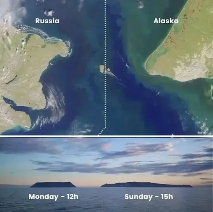 ပုံမှာ မြင်ရတဲ့ ကျွန်းနှစ်ကျွန်းက ၅ ကီလိုမီတာ (၃ မိုင်) လောက်ပဲ ဝေးပြီး ဆောင်းရာသီ ရေခဲသွားတဲ့အချိန်တွေမှာ လမ်းလျှောက်သွားရင် ကျွန်းတစ်ကျွန်းကနေ နောက်တစ်ကျွန်းကို ရောက်ဖို့ ၁ နာရီလောက် ကြာပါတယ်။ ဒါပေမဲ့ အံ့အားသင့်စရာကောင်းတာကတော့ ကျွန်းနှစ်ကျွန်းကြား အချိန်ကွာခြားမှုက ၂၁ နာရီအထိ ရှိနေတာပါပဲ။
