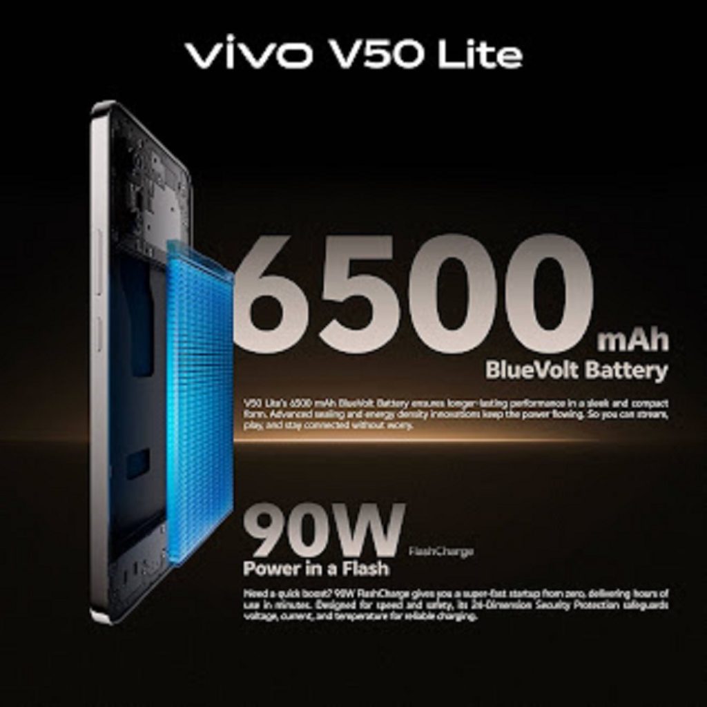 vivo V50 Lite ၏ အခရာကျသော ပါးလွှာကျစ်လစ်သည့် 6500 mAh BlueVolt Battery သည် သူမတူသော ကြီးမားသော စွမ်းအင်ကို ပါးလွှာသောဒီဇိုင်းနှင့်အတူ ယူဆောင်လာသည်။ထိုဘတ်ထရီပမာဏသည် YouTube ကြည့်လျှင် ၂၇.၄၁ နာရီနှင့် TikTok သုံးလျှင် ၁၅နာရီအထက် သုံးစွဲနိုင်မယ်ဖြစ်သောကြောင့် သုံးစွဲသူများအနေဖြင့် အနှောက်အယှက်မရှိဘဲ သုံးစွဲနိုင်မည်ဖြစ်သည်။ထို့အပြင် vivo V50 Liteသည် reverse charging အားသွင်းစနစ်ပါဝင်သောကြောင့် မိမိ၏တခြားသော ပစ္စည်းများကို အားပြန်သွင်းနိုင်မည်ဖြစ်သည်။